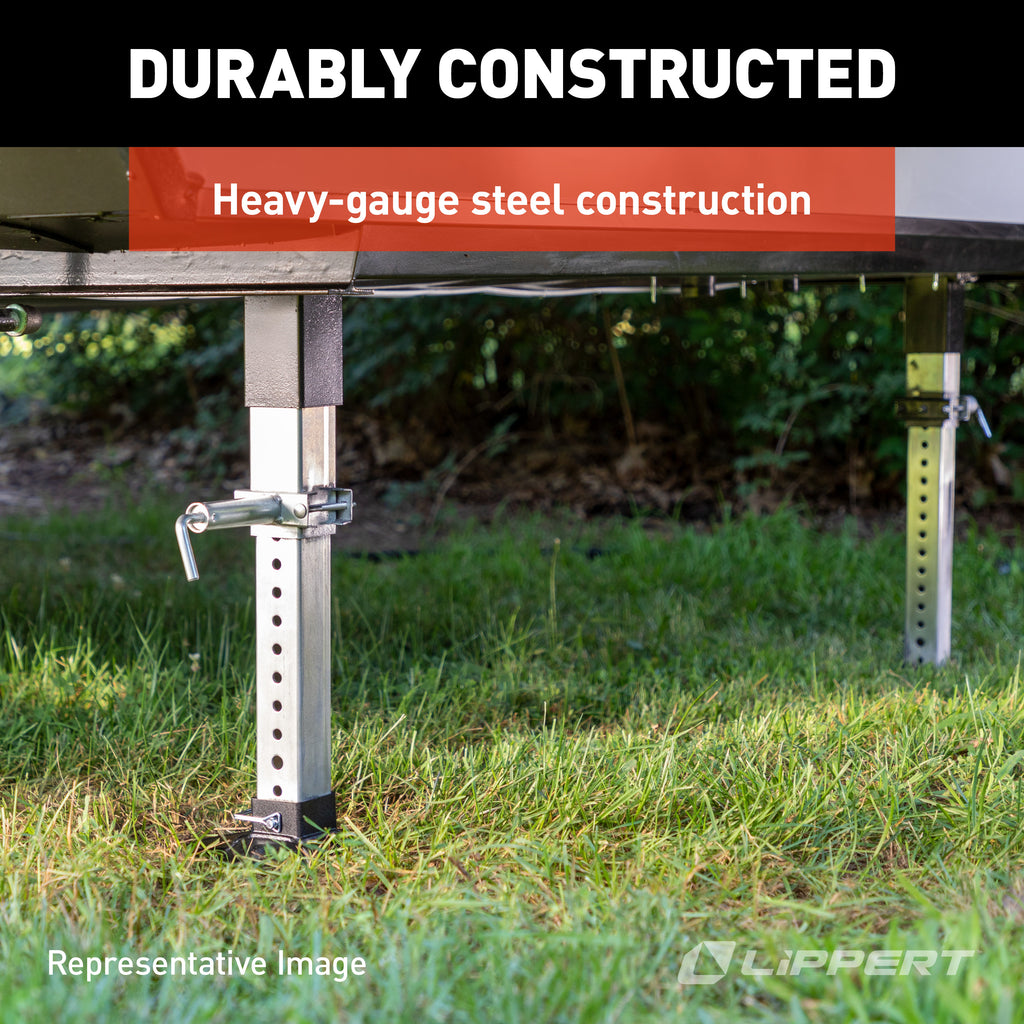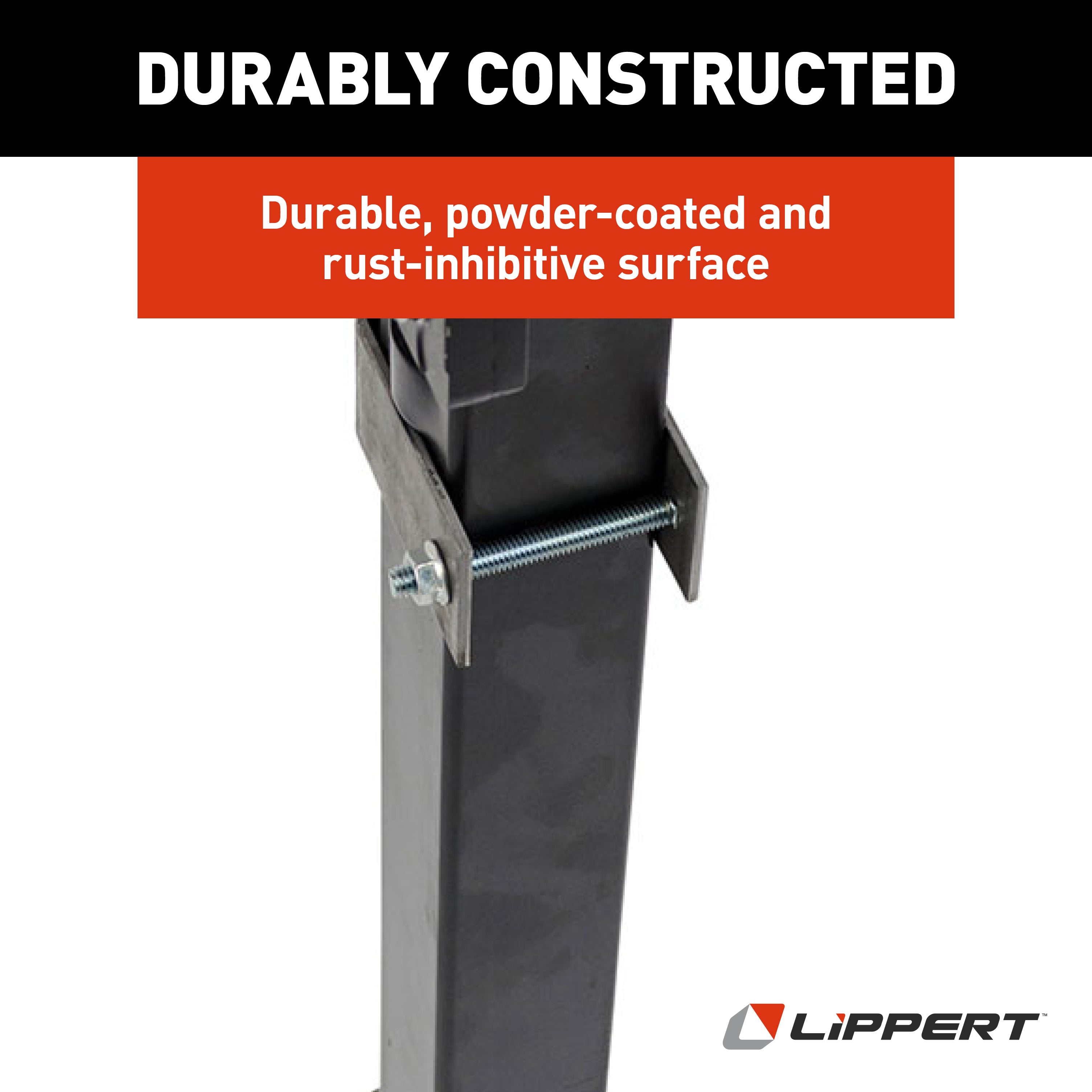 - DURABLY CONSTRUCTED - This landing gear assembly is made from heavy-gauge steel construction, a black powder-coated finish and a rust-inhibitive surface, all designed to withstand the rigors of RV travel and camping