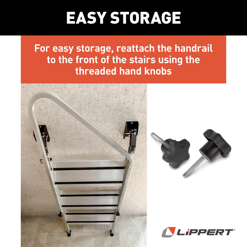 • EASY STORAGE — This RV step handrail easily stores right with the Victory Step using the included threaded hand knobs