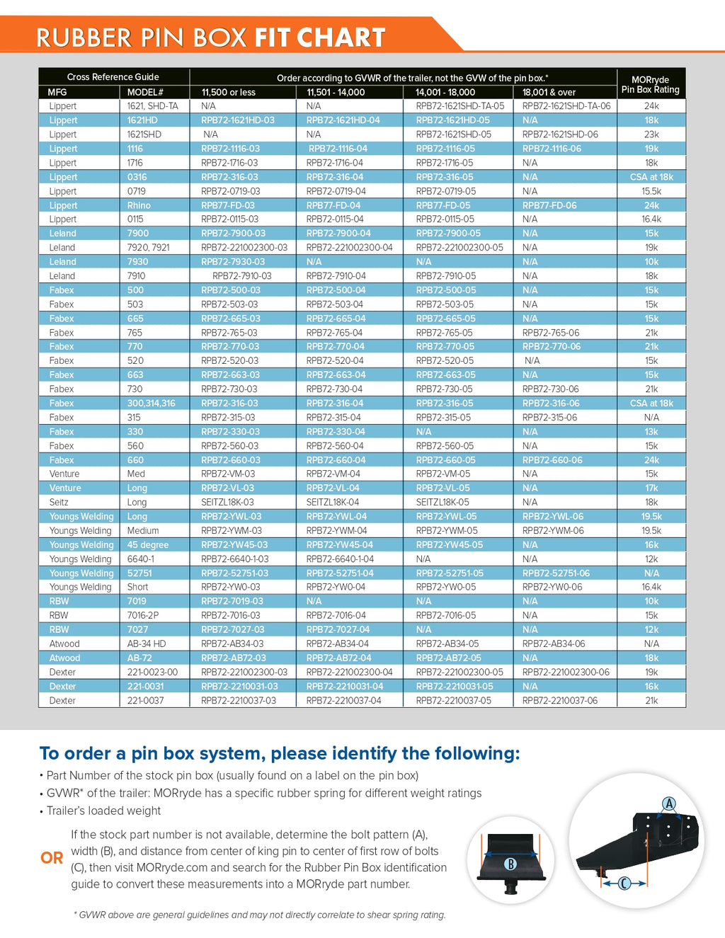 📋 Find Your Replacement: Use the comprehensive fitment chart below to identify the correct MORryde pin box for your trailer. The chart shows replacements for ALL major brands including Lippert, Dexter, Reese, Pullrite, Curt, Fabex, Venture, Seitz, Younus Welding, RBW, and Atwood. Match your current pin box brand/part number with your trailer's GVWR to find the correct MORryde replacement.