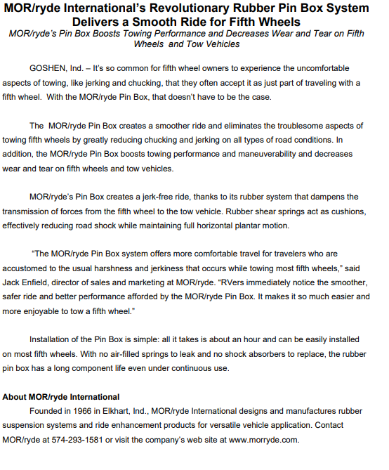 Founded in 1966 in Elkhart, Indiana, MORryde International designs and manufactures premium rubber suspension systems and ride enhancement products for versatile vehicle applications. With decades of engineering expertise and a commitment to quality, MORryde has become the trusted name in fifth wheel pin box technology. Every MORryde product is backed by rigorous testing and a dedication to improving the RV towing experience.