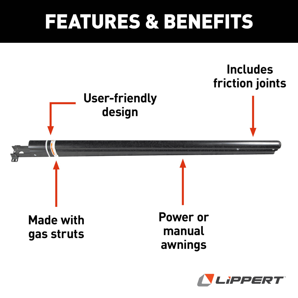 If you need to replace your RV awning's support arm, look no further than Solera®. The Solera awning support arms by Lippert™ will help get your RV's awning back in working condition in no time. Equipped with gas struts for easy operation and friction joints that help prevent water and debris from pooling in the center of your awning, this replacement support arm is a must-have and can be used on both power and manual awning assemblies.