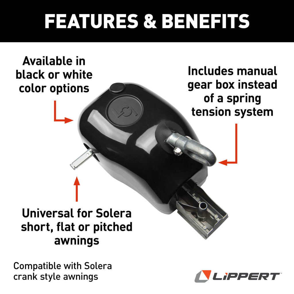 Available in black or white, this replacement kit includes (1) Solera manual crank style RV awning drive head assembly. This kit should be used with, but does not include, Solera crank style idler head, rollbar, fabric, arm assemblies and crank hook. Please reference your owner's manual before purchase.